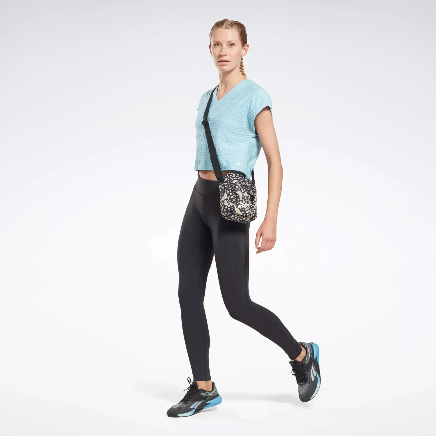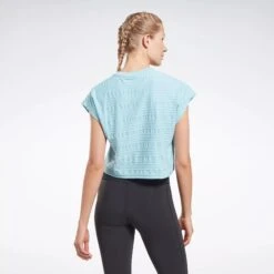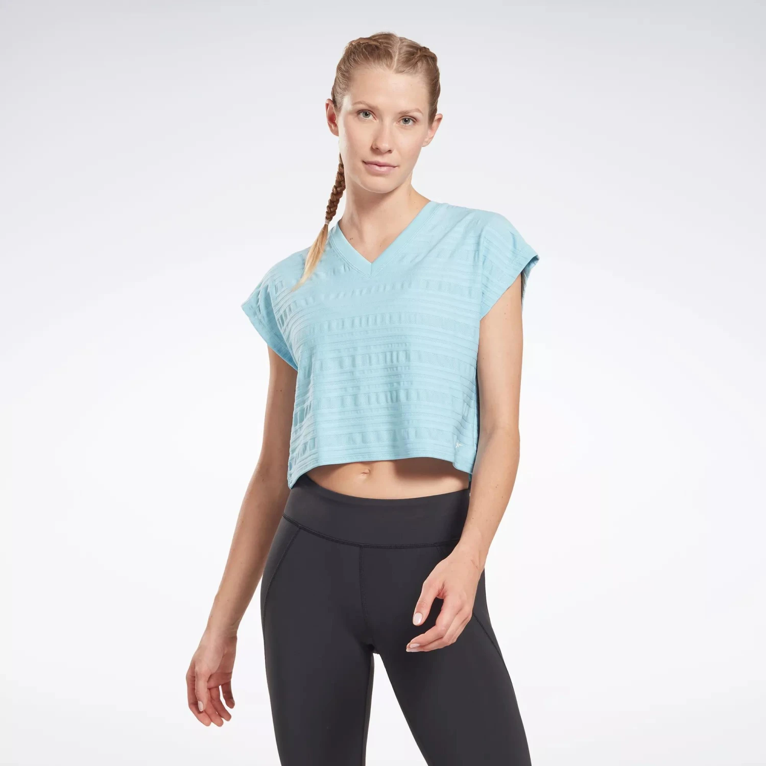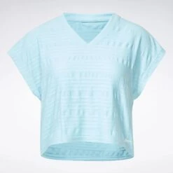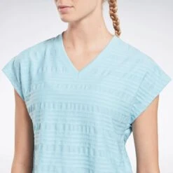 Work hard, and look good doing it. This women’s Reebok t-shirt has built-in mesh that keeps you ventilated when your training session heats up. The stretchy build lets you move freely through the last rep, and the V-neck design adds a touch of style.